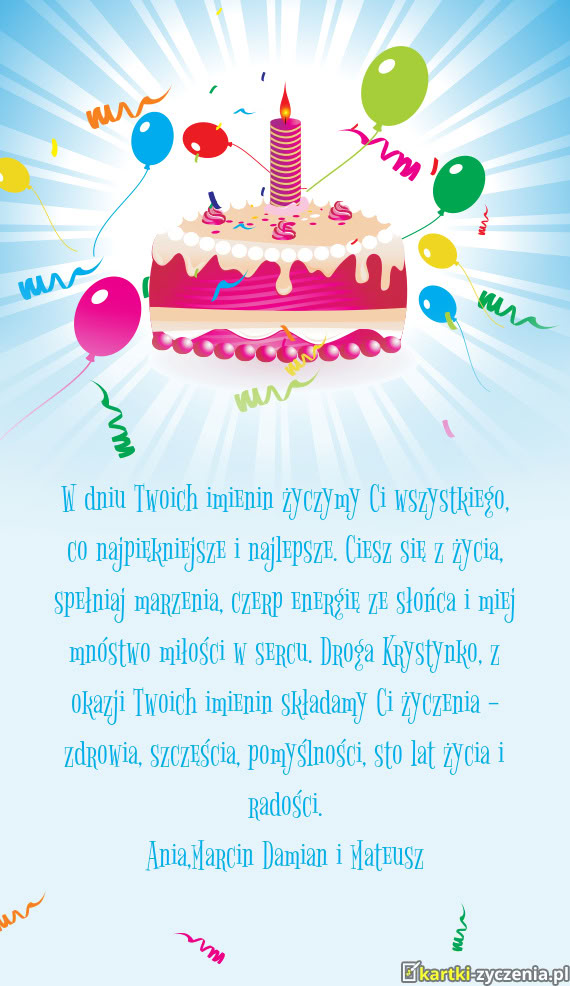 W dniu Twoich imienin życzymy Ci wszystkiego, co najpiękniejsze i najlepsze. Ciesz się z życia, spełniaj marzenia, czerp energię ze słońca i miej mnóstwo miłości w sercu. Droga Krystynko, z okazji Twoich imienin składamy Ci życzenia - zdrowia, szczęścia, pomyślności, sto lat życia i radości.
