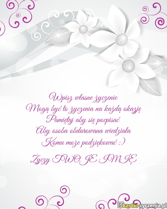 Życzymy Ci szczęścia, dużo radości i długiej, szczęśliwej przyszłości. Niech los Ci z oczu łez nie wyciśnie, niechaj się w życiu wiedzie pomyślnie, wszystko, co piękne i wymarzone, w dniu Twego święta niech będzie spełnione! Życzy córka Kinga, zięć Szymon i wnuczek Czarek